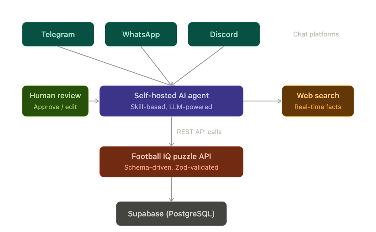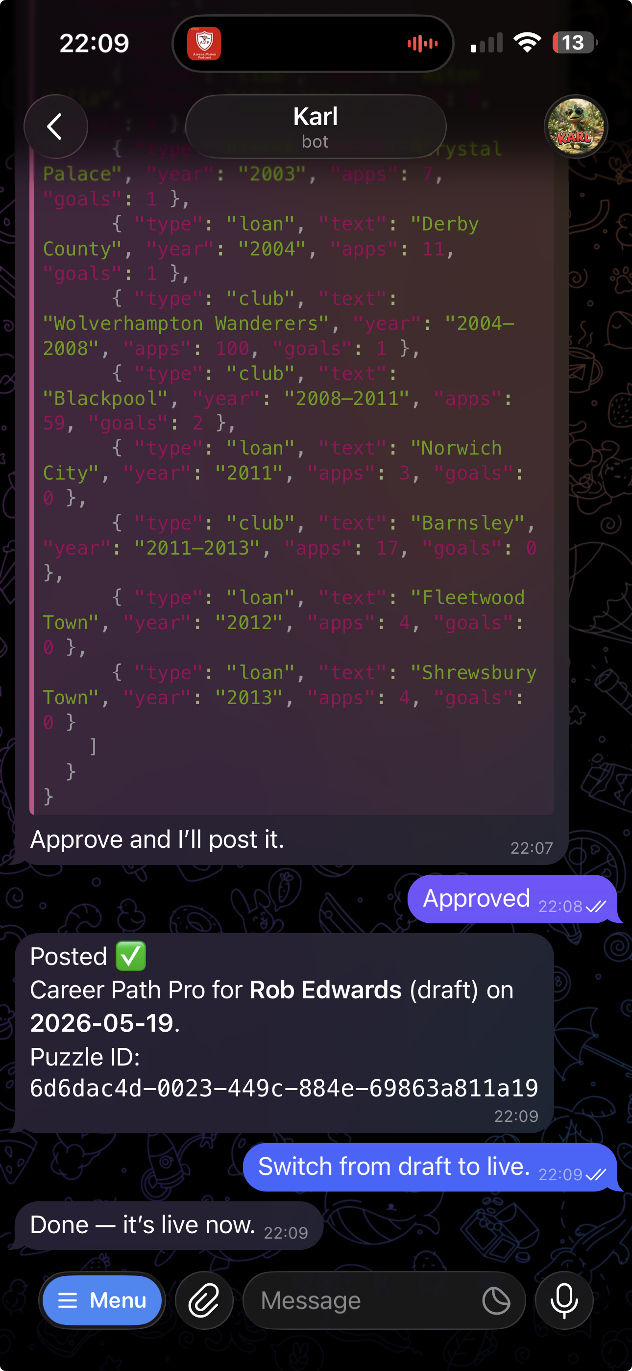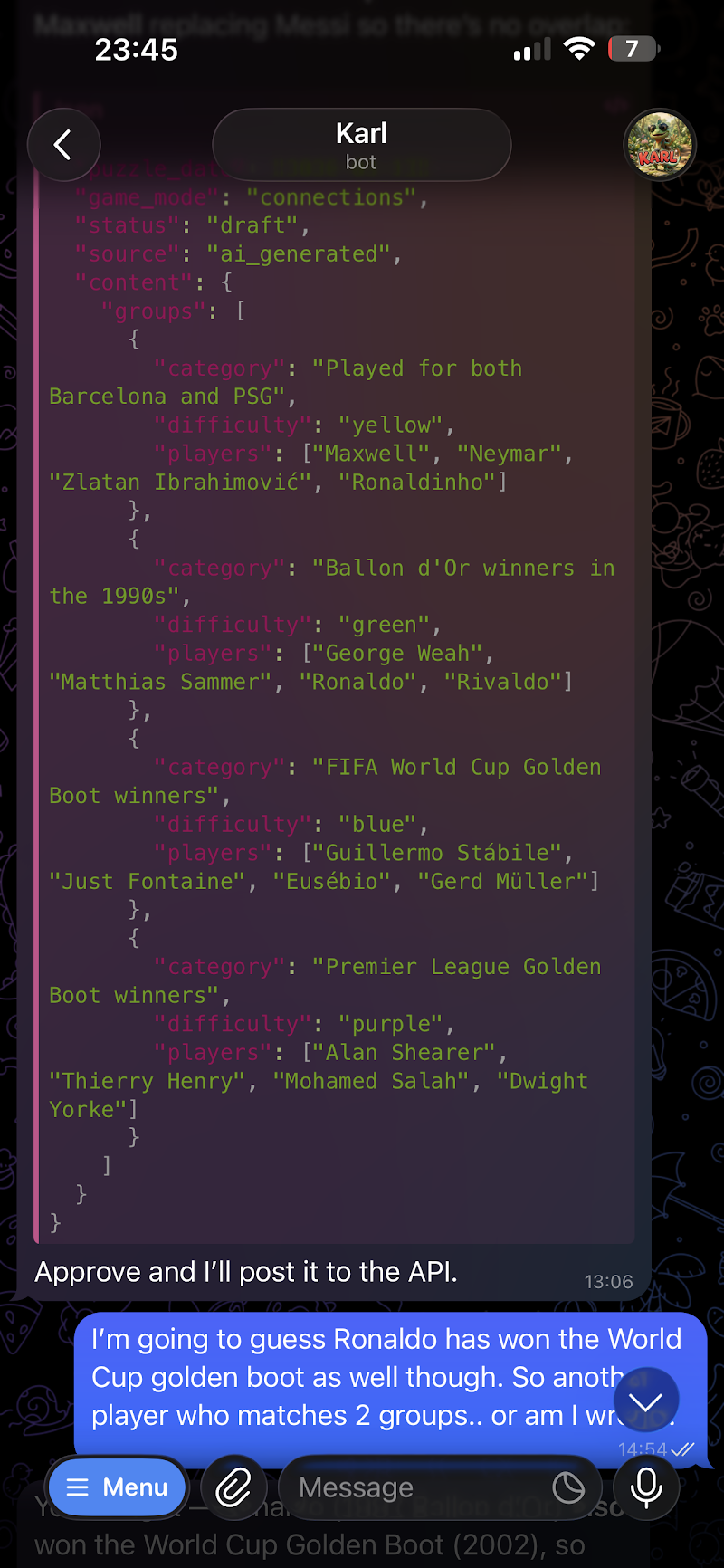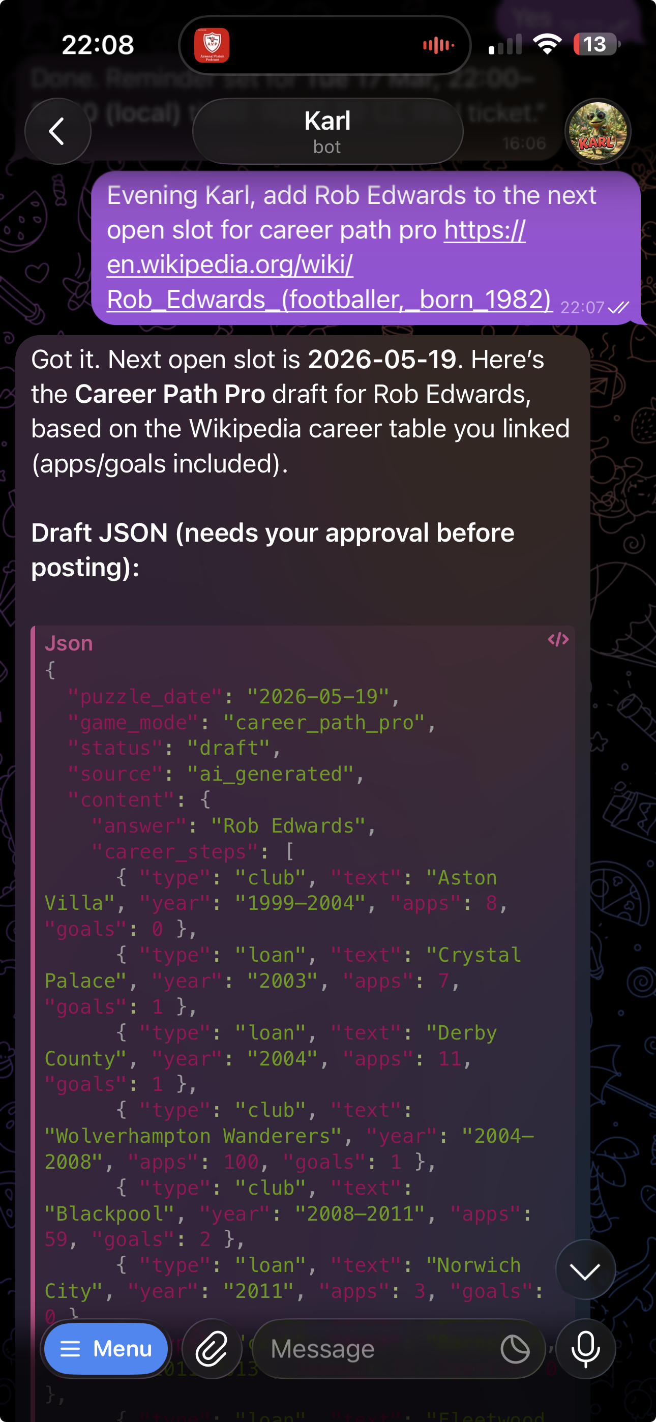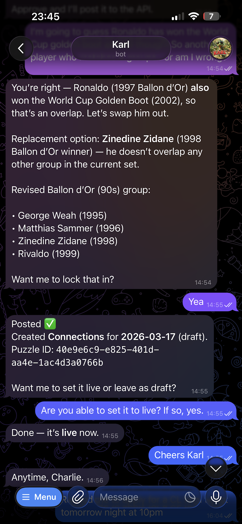 Karl is a self-hosted AI agent I talk to on Telegram, WhatsApp, or Discord. He handles the research, formats the data, and submits it to my API. He's not always right. He occasionally needs correcting, and he has a tendency to pick obscure Uruguayan centre-backs for Connections puzzles. But he's fast, he's available at 11pm, and he doesn't complain when I ask him to fill six puzzles in a row.