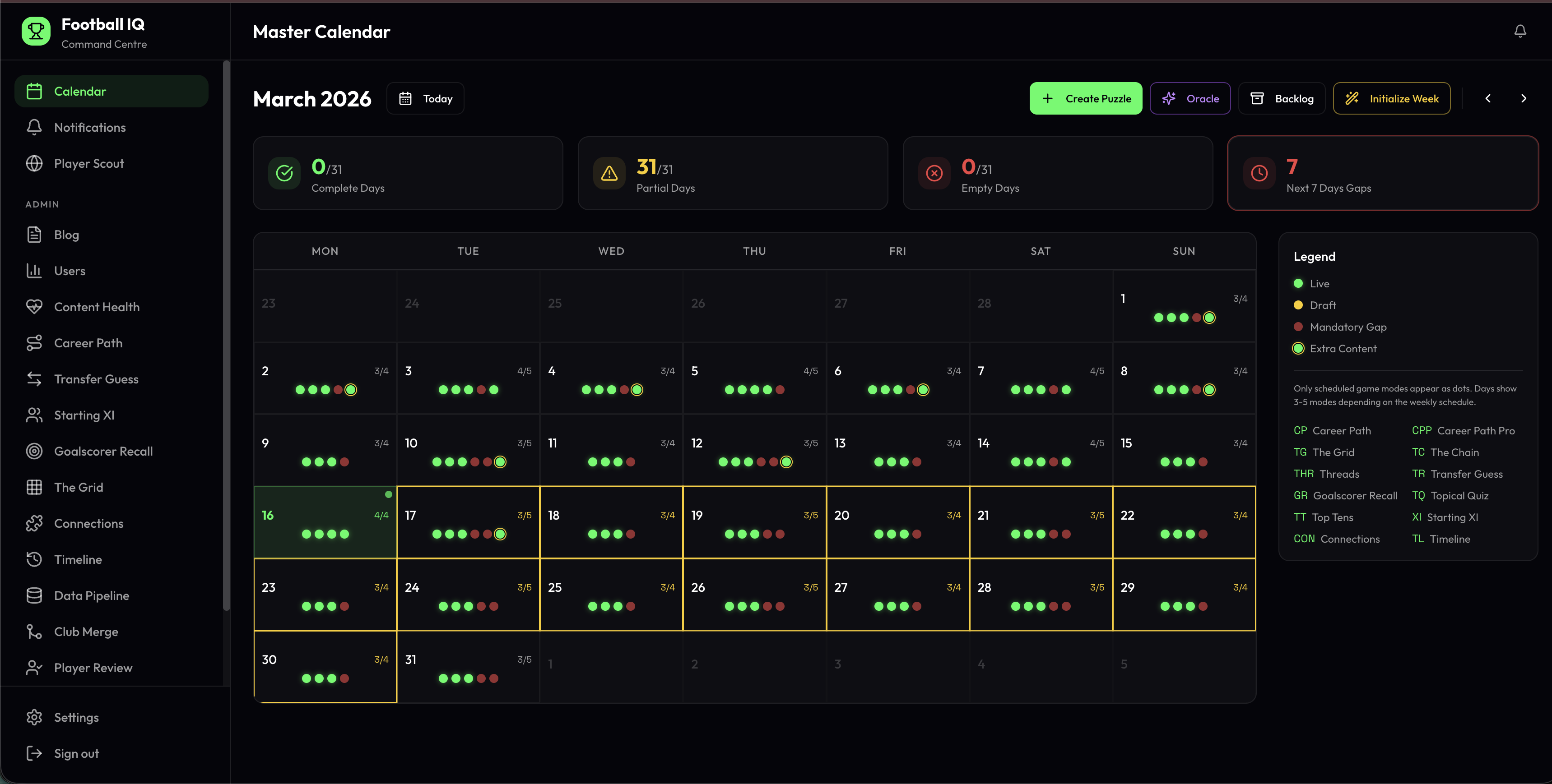 Football IQ is a daily football trivia app with 12 game modes. Every day, it needs fresh puzzles across Career Path, Connections, Starting XI, and more. That adds up to thousands of puzzles a year.