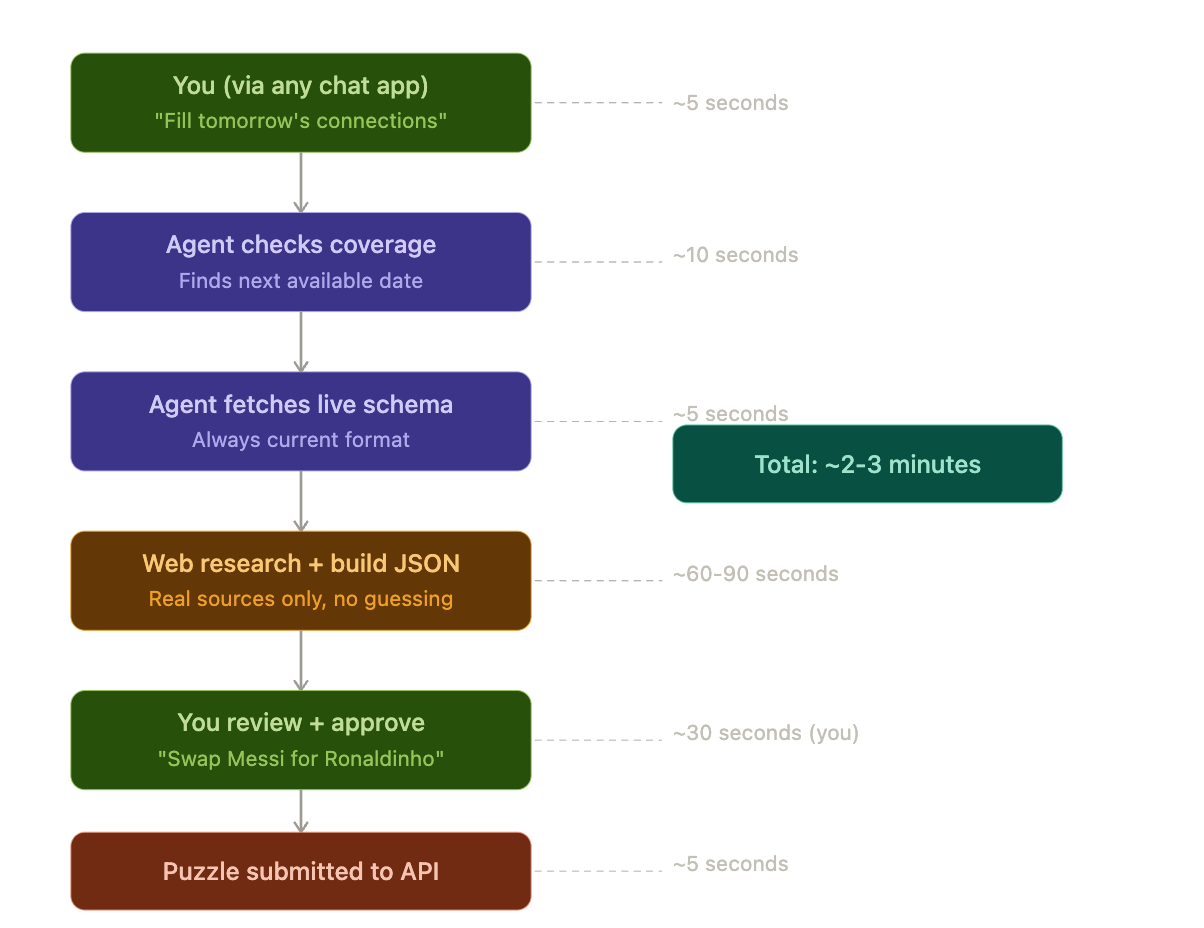 He checks the API for the next empty slot, grabs the current schema, searches the web for four football-related connection groups, cross-checks all 16 names to make sure there's no overlap, and shows me the result. I might say "swap Messi for Ronaldinho in group 2" or just "looks good". He submits, reports back with the puzzle ID, and we're done.